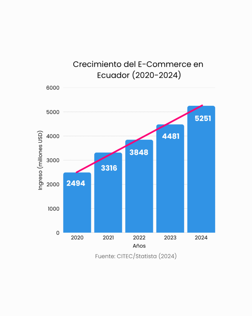 El comercio electrónico en Ecuador no solo ha crecido, ha duplicado su tamaño en los últimos cinco años. Según datos de CITEC y Statista (2024), los ingresos del eCommerce pasaron de USD 2.494 millones en 2020 a USD 5.251 millones en 2024, lo que representa un aumento del 110% y un crecimiento promedio anual del 21%.