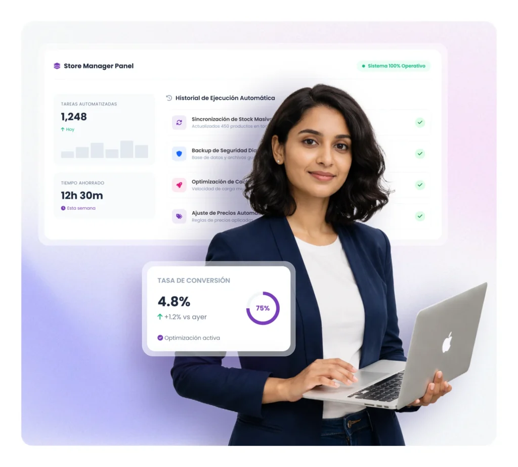 Es un sistema completo de gestión que te libera del trabajo operativo, garantiza estabilidad técnica y mantiene tu tienda en evolución constante, sin necesidad de contratar más personal.